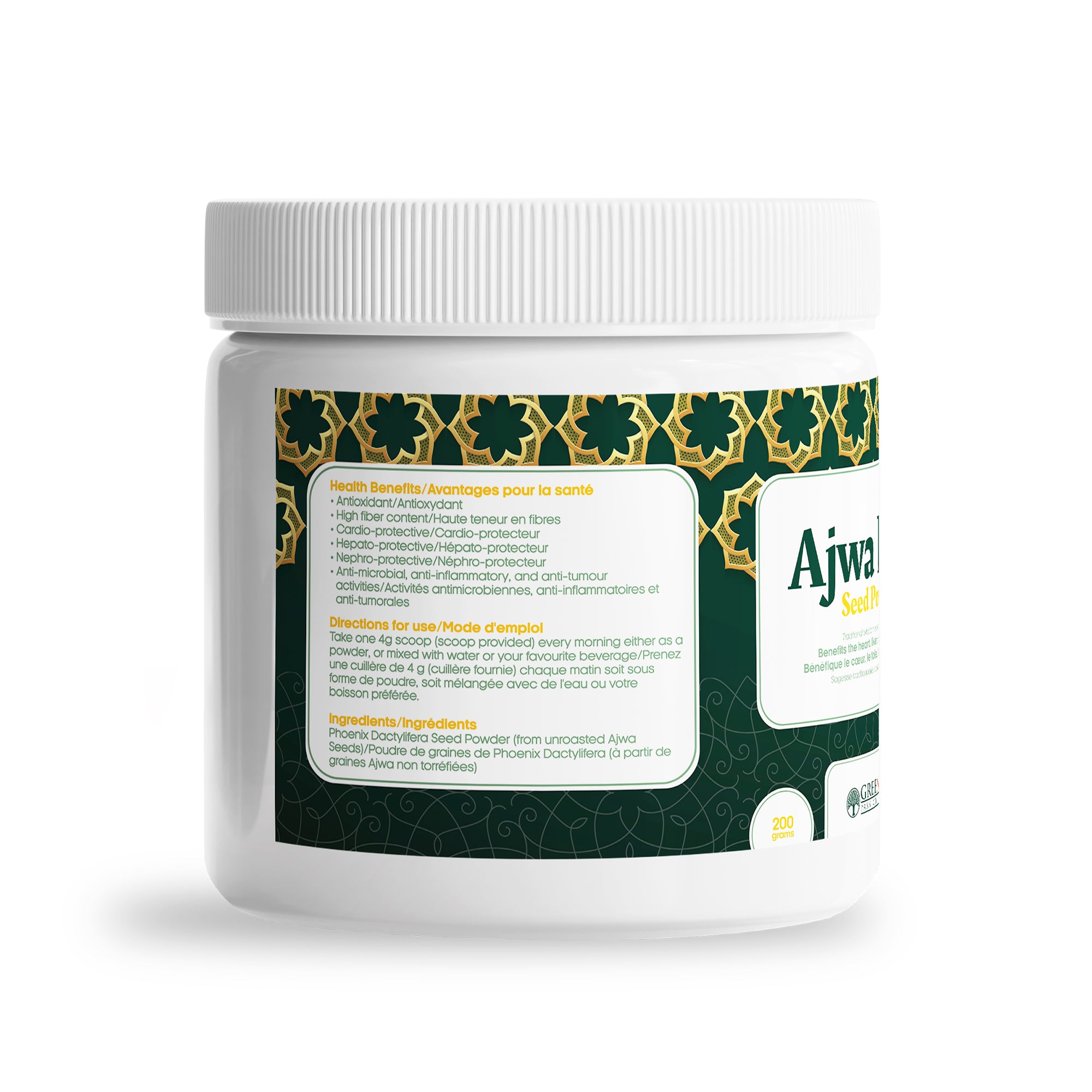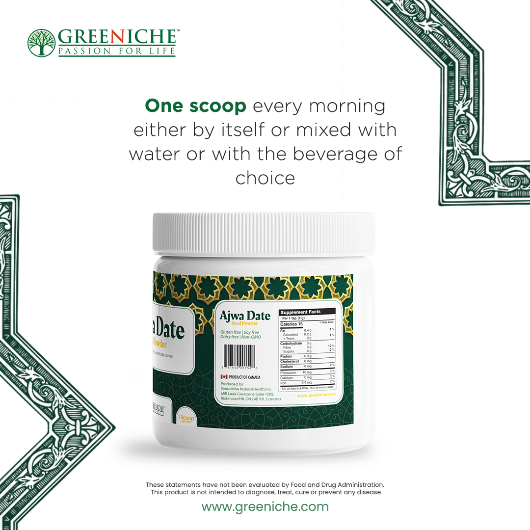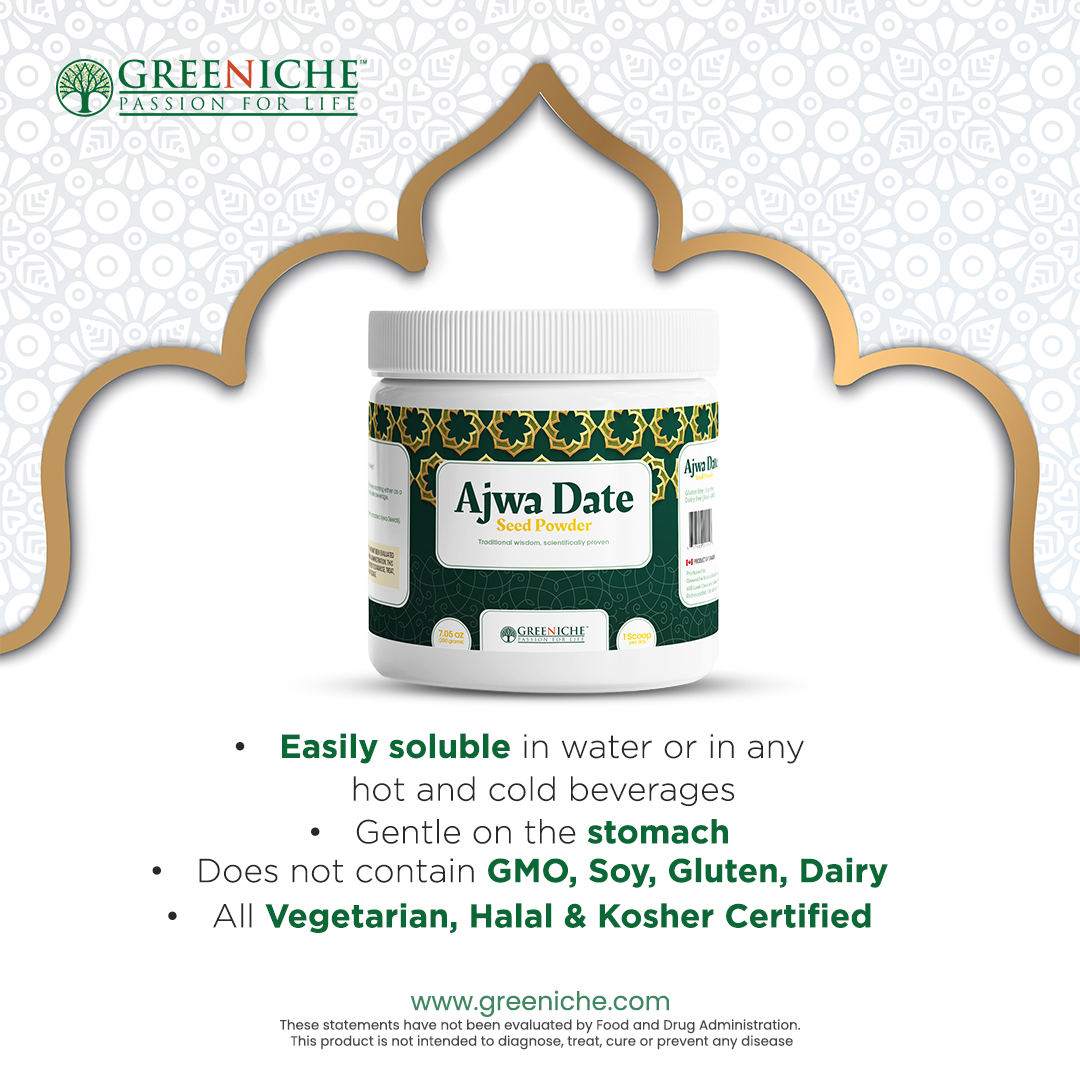 Greeniche's Halal Certified Ajwa Date Seed Powder encapsulates the health benefits of rare Ajwa dates in a convenient powder form. Sourced meticulously from Saudi Arabia, our Ajwa dates are ground raw, without roasting, to preserve maximum efficacy and nutritional value. Scientifically proven to benefit vital organs such as the heart, liver, and kidneys, Ajwa dates are revered for their protective properties against injury or disease. Elevate your dietary fiber intake while safeguarding your health with Greeniche's Ajwa Date Powder.