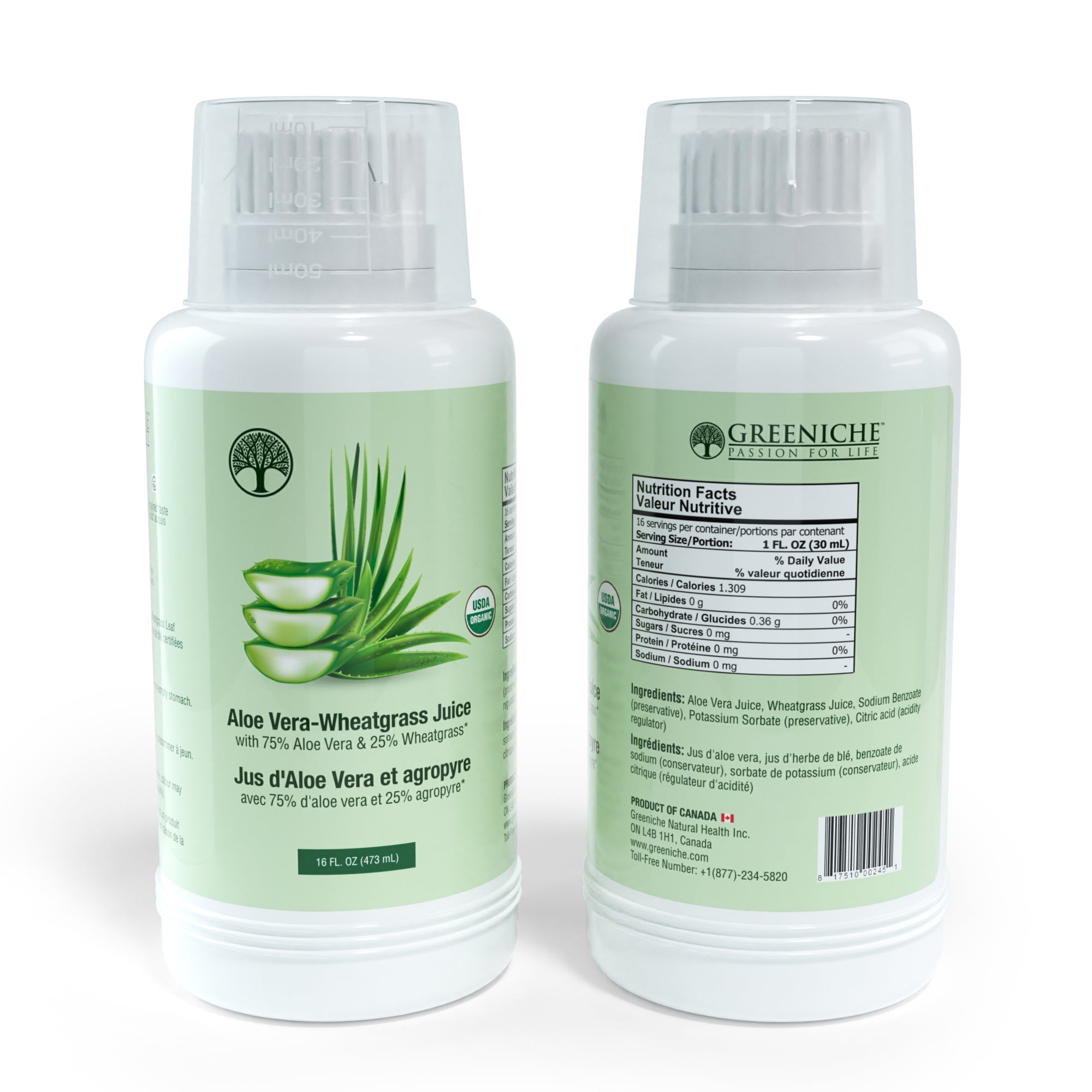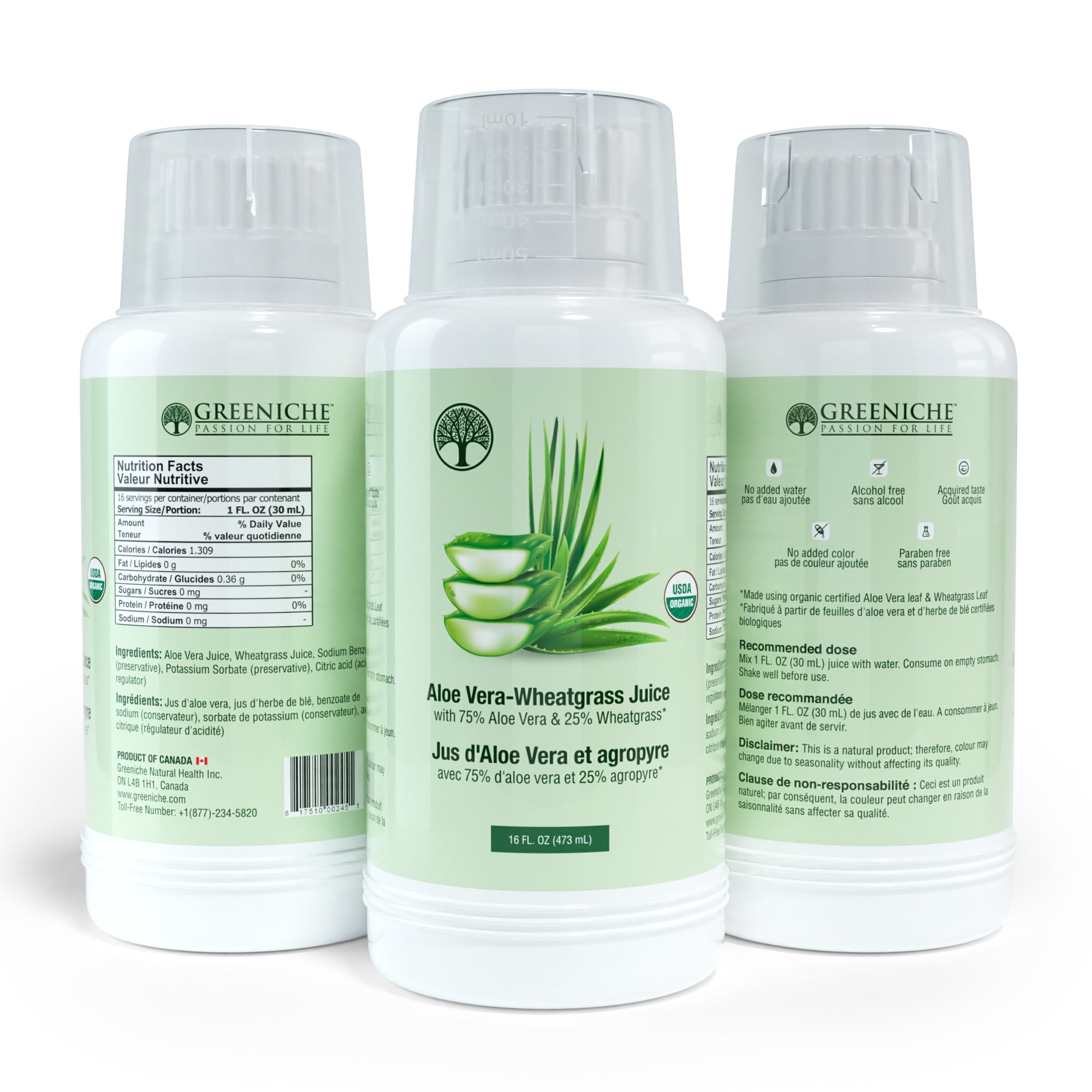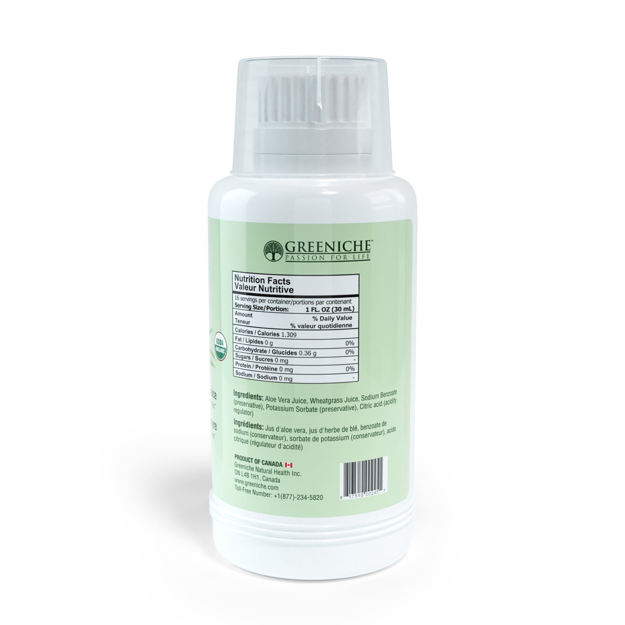 Experience the ultimate detoxifying and rejuvenating elixir with Greeniche's Aloe Vera Wheatgrass Juice. This powerful blend detoxifies your gut, promotes radiant skin, and contributes to overall good health and immunity. With its antioxidant, antibacterial, and anti-inflammatory properties, this all-natural juice is the perfect addition to your daily diet. Rich in essential nutrients like iron, calcium, enzymes, magnesium, phytonutrients, 17 amino acids, chlorophyll, proteins, and vitamins A, C, E, K, and B complex, it aids in eliminating impurities and stored toxins in the blood while supporting healthy liver function. Transform your well-being with this exceptional Aloe Vera Wheatgrass Juice and place your order today!