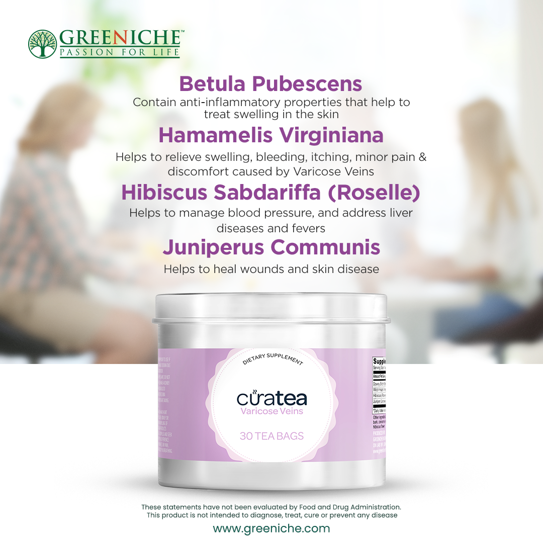 Discover relief from the discomfort of varicose veins with CuraTea Varicose Veins. This herbal tea blend is thoughtfully crafted to support vascular health and improve circulation. Enriched with powerful botanicals like horse chestnut and butcher's broom, CuraTea Varicose Veins helps reduce swelling and alleviate the symptoms associated with varicose veins. Enjoy the soothing flavors while knowing you're taking a step towards healthier, happier legs. Embrace the freedom to move with confidence with CuraTea Varicose Veins . Pack Size: 30