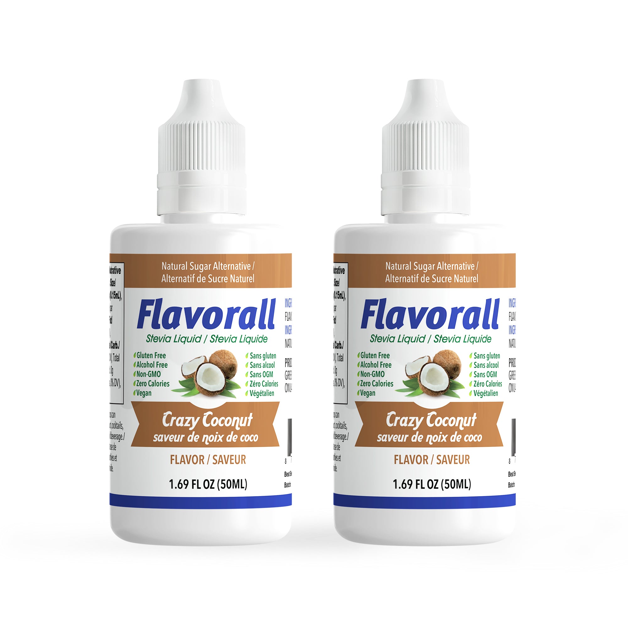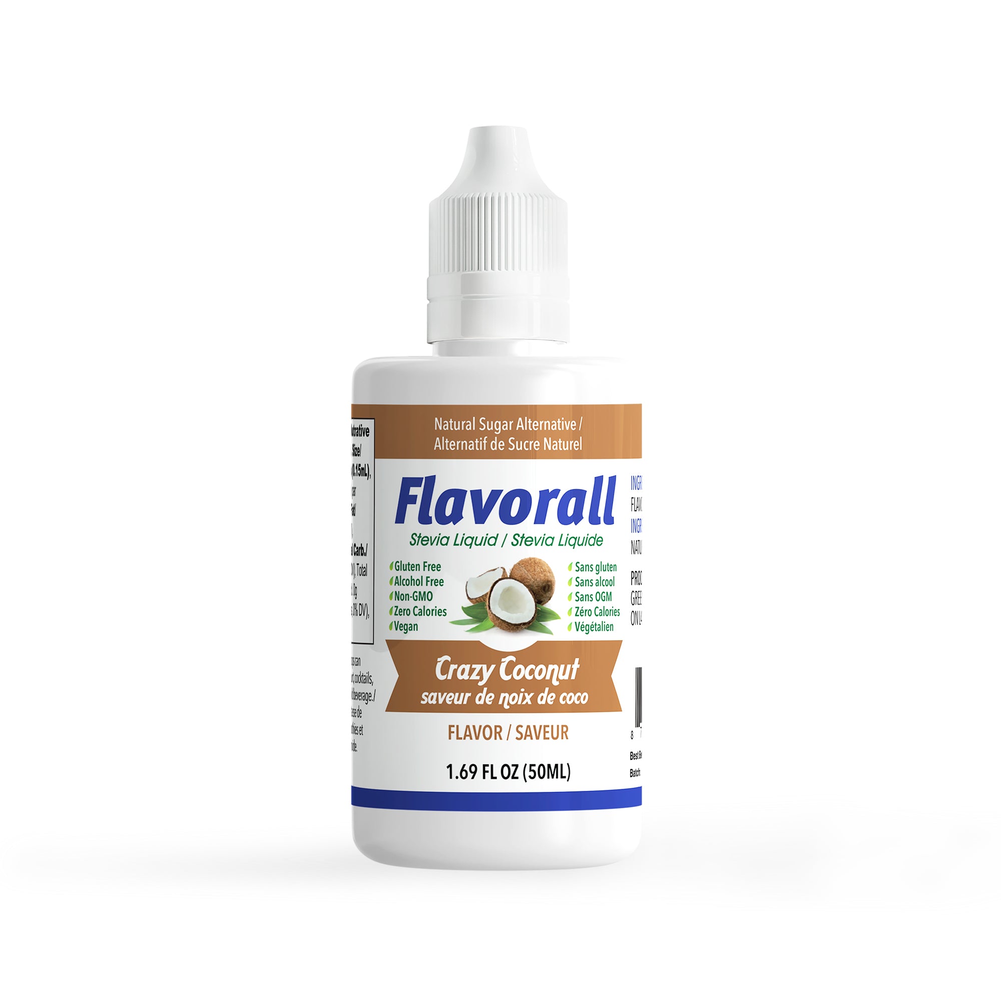 Flavorall Crazy Coconut liquid sweetener has the perfect creamy, sweet, and earthy flavor to it. Coconut is also a great healthy alternative to your diet so instead of cutting or shredding some coconut, switch to our coconut liquid sweetener. The ingredients in it are gluten-free, all-natural, non-alcoholic, Non-GMO, and have zero calories in it. All you gotta do is pour in a couple of drops in your favorite drink of choice or any meal as well. Pack Size: 50ml.