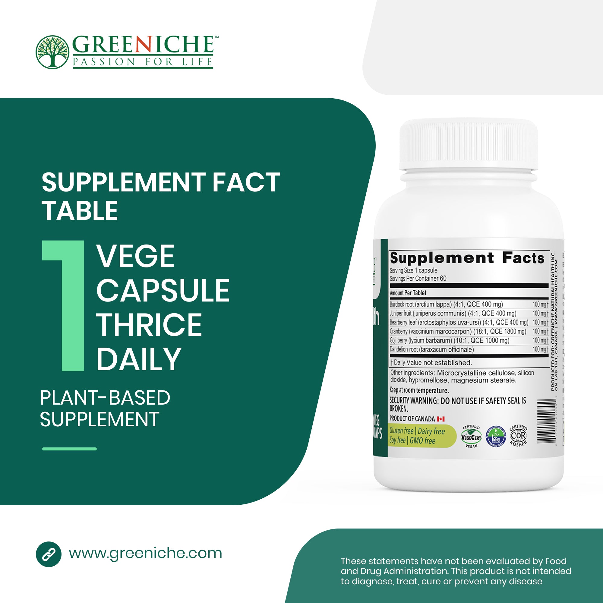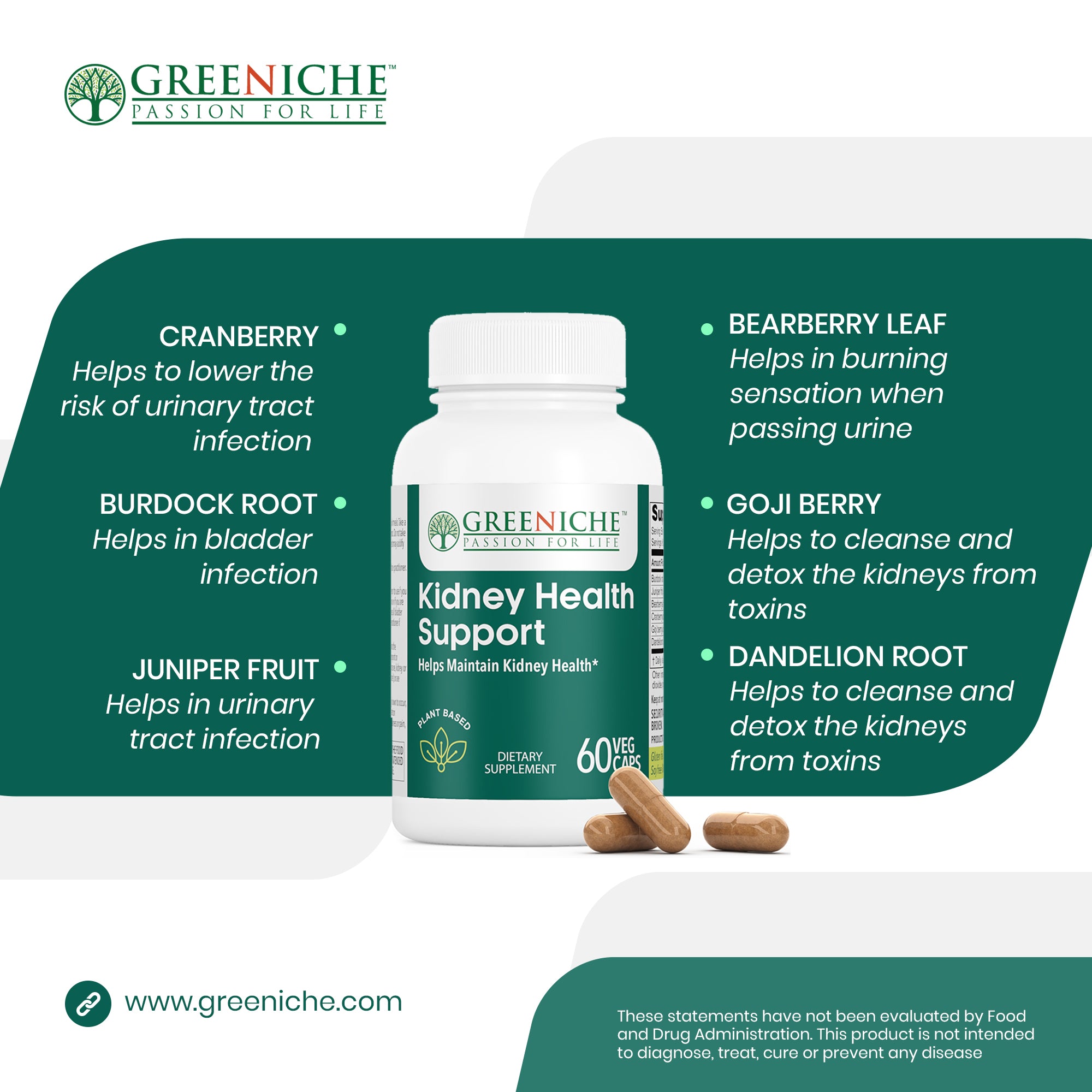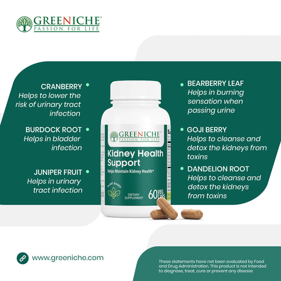 Discover the holistic benefits of Greeniche's Halal Certified Kidney Health Support, a natural supplement crafted to potentially promote kidney health and alleviate symptoms linked to urinary tract infections. Our formula harnesses the power of Burdock, Juniper, Bearberry, and Dandelion, herbal diuretics known to aid in the elimination of accumulated waste products from the kidneys. Embrace the nurturing support of Greeniche Kidney Health Support for comprehensive kidney care.