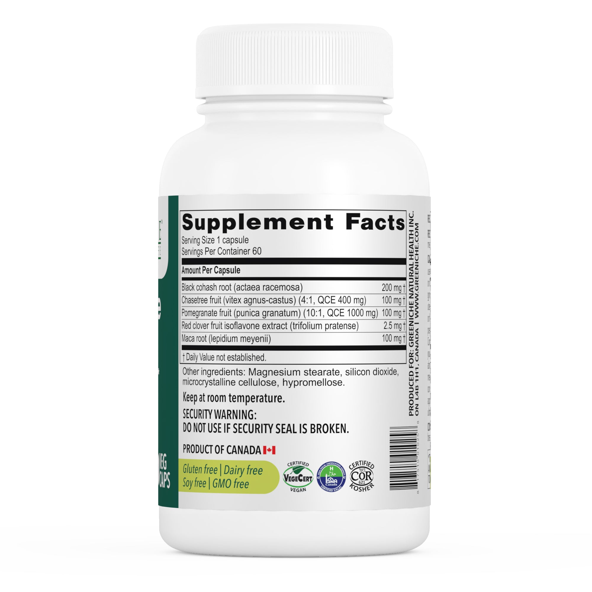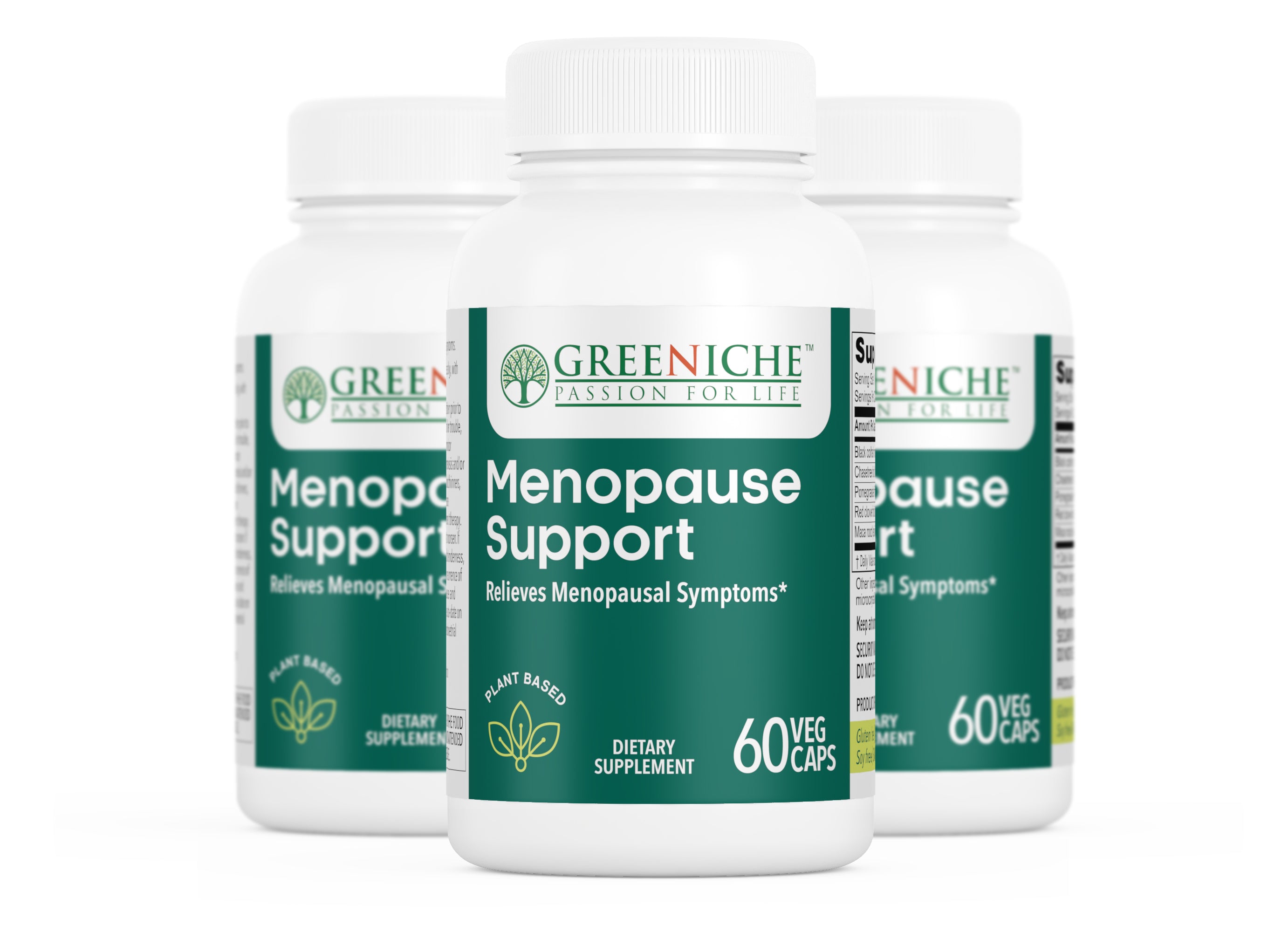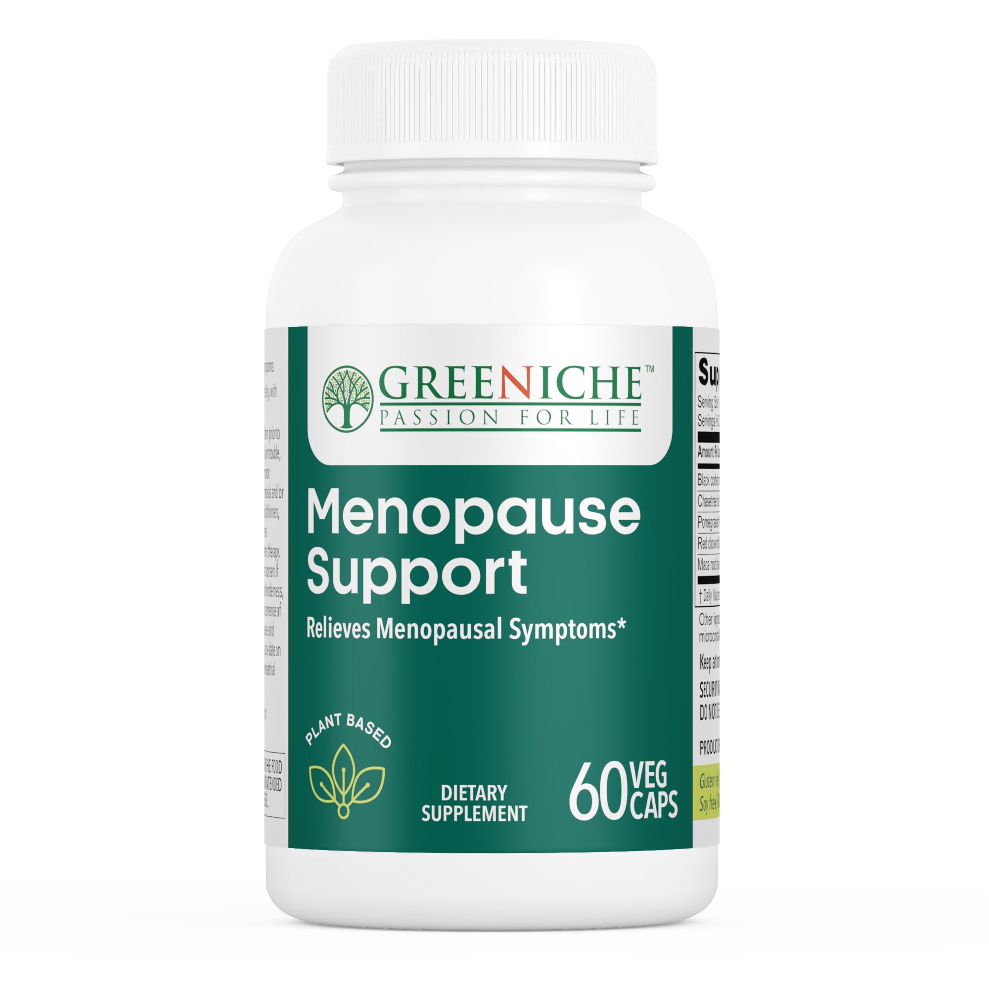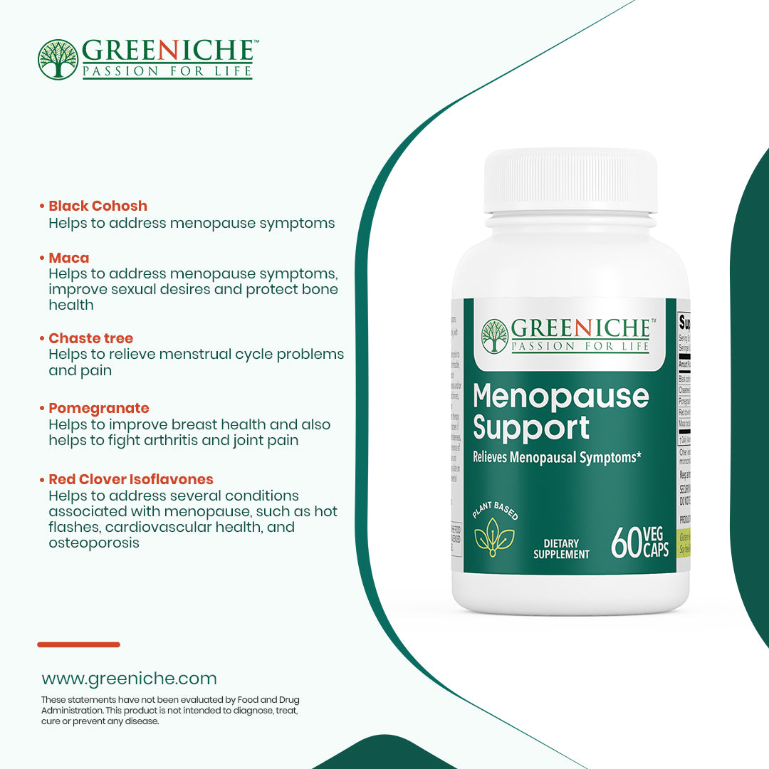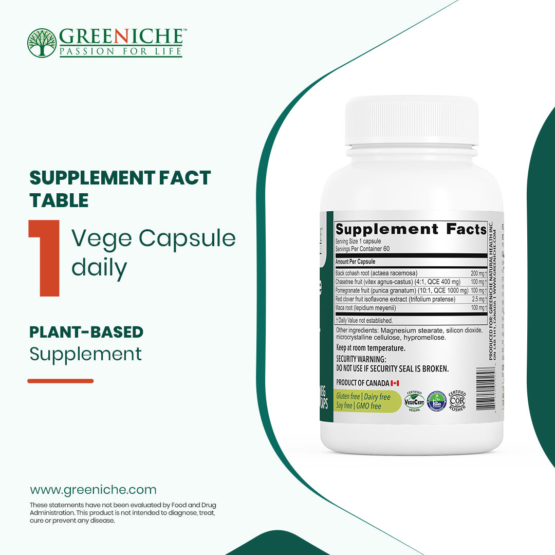 Discover Greeniche's Halal Certified Menopause Support, an all-natural herbal supplement meticulously designed to alleviate symptoms commonly associated with menopause, including hot flashes and premenstrual symptoms. Our formula harnesses the power of ingredients such as maca, black cohosh, castus (chastetree berry), pomegranate, and red clover, which have long been used in herbal medicine to relieve menstrual discomfort and promote healthy mood balance during menopause